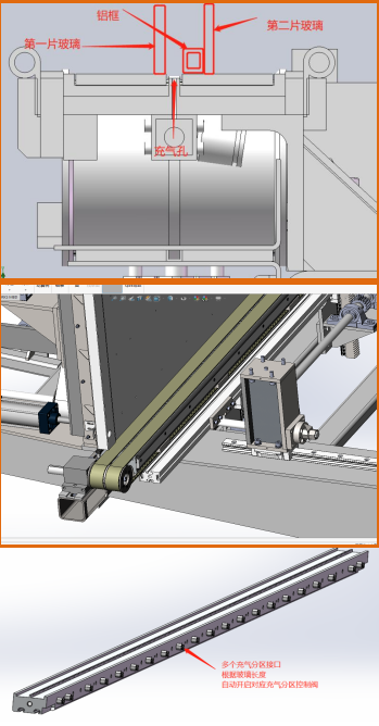 There is a partition control of the argon gas filling beam. When using different sizes of glass, it will automatically detect the length of the glass and turn on the corresponding length of the argon gas hole, saving gas.