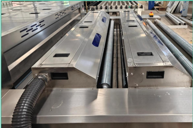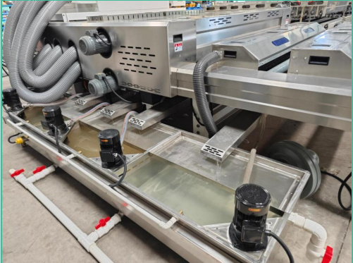 Witha stainless steel water sink and high-pressure pre-spraying (high-pressure pump) in loading ( in-feed), the rubber roller can pre-wash automatically to clean out the glass powder or scraps. |