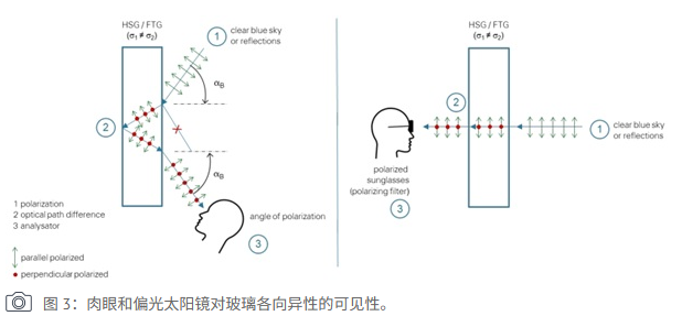Figure 3. Visibility of glass anisotropy under normal vision and through polarized sunglasses.In addition, several technical parameters influence anisotropy intensity: