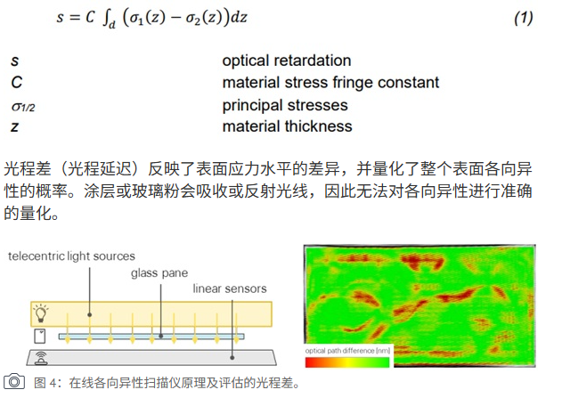 Modern online anisotropy scanners allow manufacturers to measure optical anisotropy quantitatively during production. These systems use polarimetric measurement principles combined with telecentric light sources emitting multiple wavelengths. By analyzing image‑based data, the scanner calculates the optical path difference for each pixel across the glass surface using the stress‑optical law. The measured optical retardation provides a numerical indication of the residual stress distribution and the likelihood of visible anisotropy across the panel. However, certain surface conditions—such as coatings or glass dust—may interfere with measurement accuracy because they absorb or reflect light.